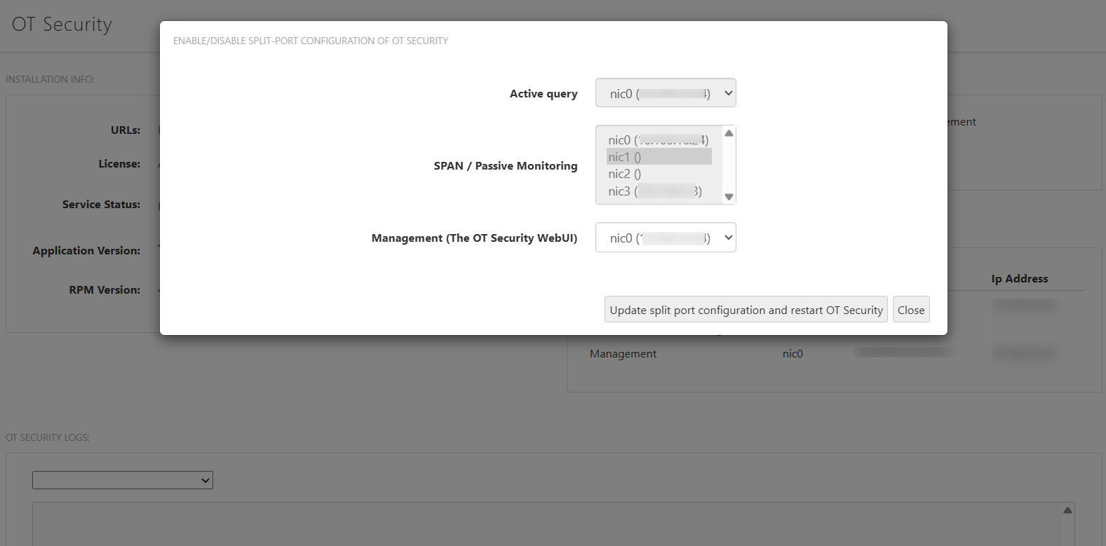 单击“更新拆分端口配置并重新启动 OT Security”。