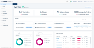 环境中资产和漏洞的当前状态。包含针对每种资产类型(OT 控制器、网络资产、IoT 资产)的单独小组件,显示该类别中的资产数量和高风险资产的数量。 注意:风险评分在 70 分及以上的资产被视为高风险资产。