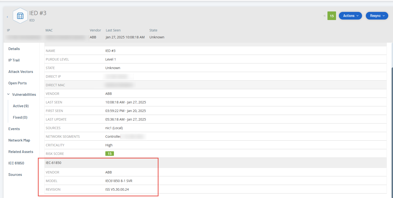 “详细信息”页面上的“IEC 61850”部分显示特定 IED 资产的以下配置。