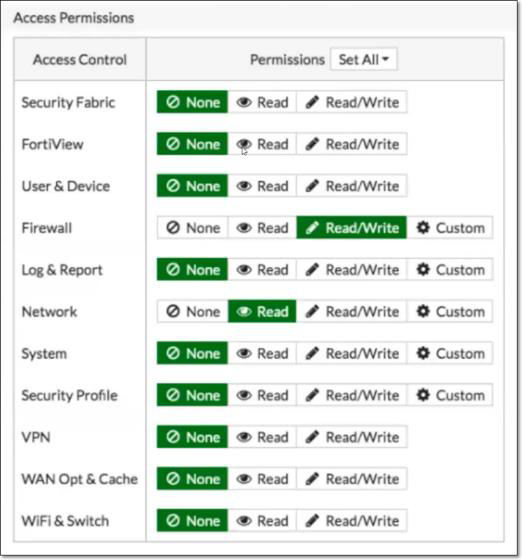 注意:对于源地址(确保仅可通过受信任的主机使用 API 标记所需的地址),请使用 OT Security 装置 IP 地址。为 OT Security 创建管理员配置文件时,确保根据以下设置应用访问权限: