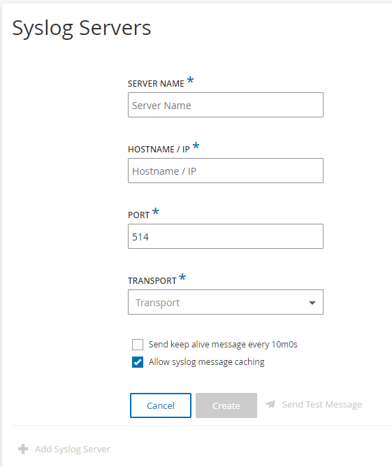 单击“+ 添加 Syslog 服务器”。此时会出现“Syslog 服务器”配置窗口。