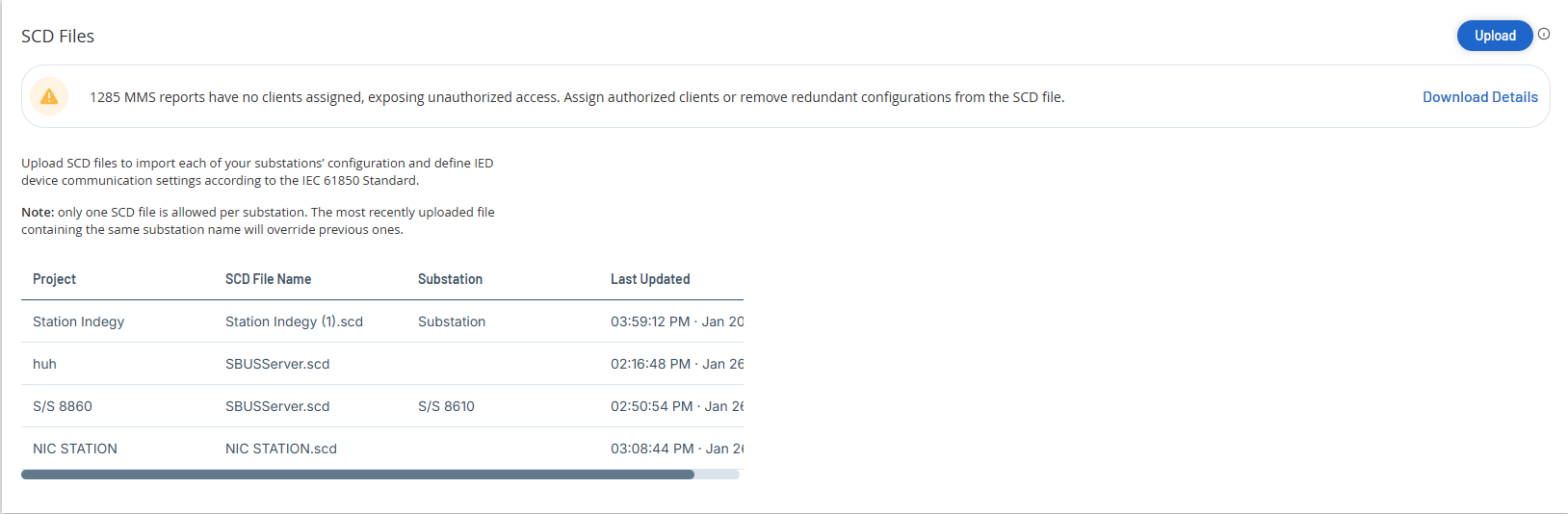 注意:只能为每个变电站上传一个 SCD 文件。如果最近上传的文件包含相同的变电站名称,之前的文件会被覆盖。 -