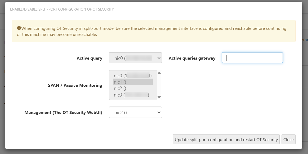 单击“更新拆分端口配置并重新启动 OT Security”。