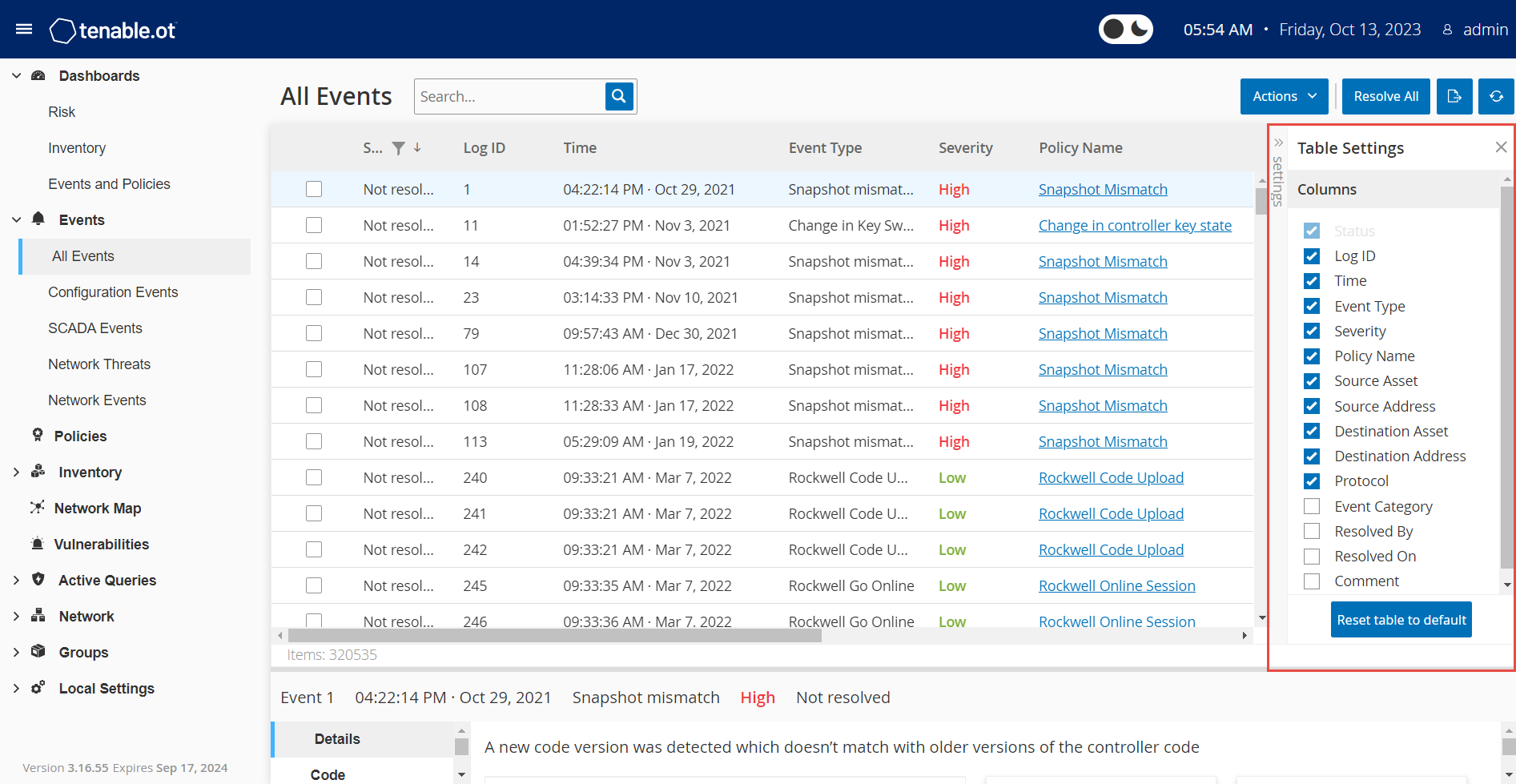 OT Security 页面以表格格式显示数据以及每个项目的列表。这些表格具有标准化的自定义功能,便于您轻松访问相关信息。