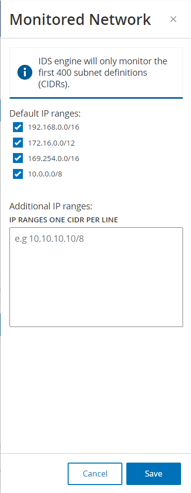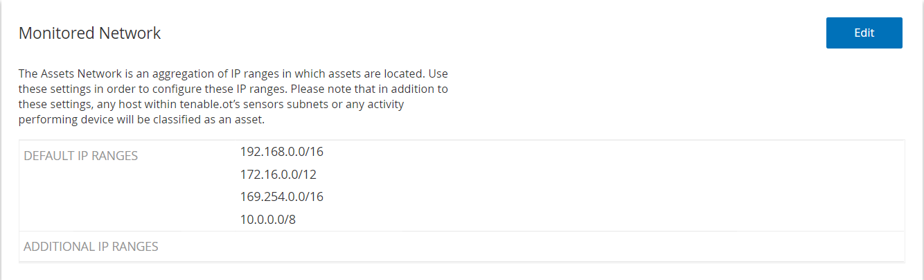默认情况下,OT Security 会配置三个默认公共范围:10.0.0.0/8、172.16.0.0/12 和 192.168.0.0/16,以及链接本地范围 169.254.0.0/16 (APIPA)。