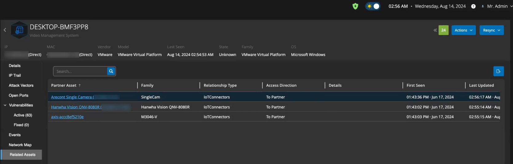 以 IP 摄像头为例,您可以查看管理该摄像头的视频管理系统 (VMS) 服务器。在“OT Security 清单”页面上,导航到 VMS 应用程序服务器即可在“清单”>“相关资产”页面上查看该服务器管理的所有摄像头。