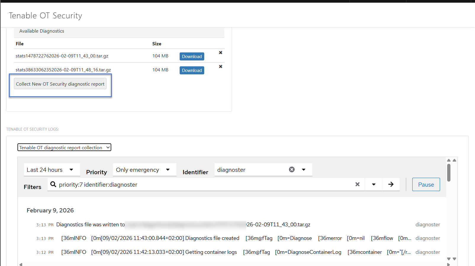 您可以从 Tenable Core 生成和导出特定于 Tenable OT Security 的诊断报告以进行故障排除。
